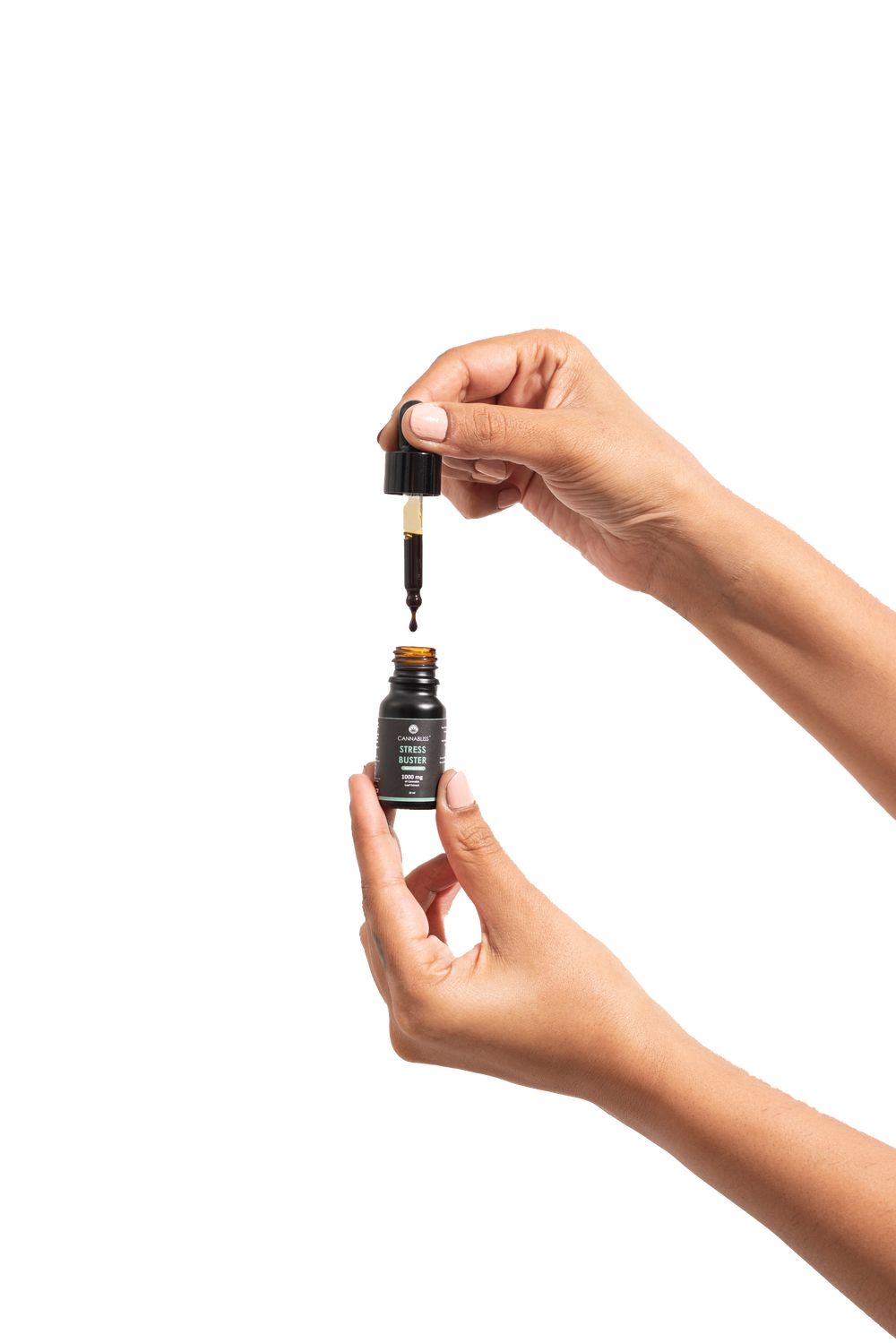 Stress Buster oil is made up of 10% cannabis leaf extract, 90% medium-chain triglyceride oil, and beneficial herbs such as tulsi, spikenard, and spearmint.